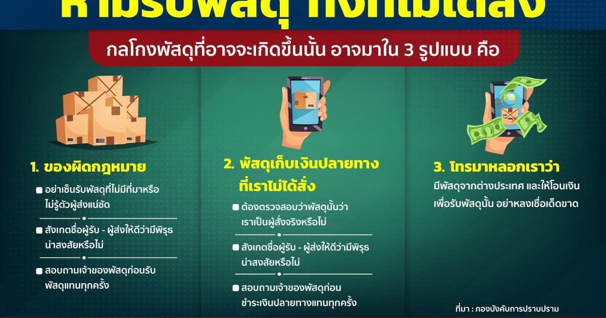 – อย่าเซ็นรับพัสดุที่ไม่มีที่มาหรือไม่รู้ตัวผู้ส่งแน่ชัด