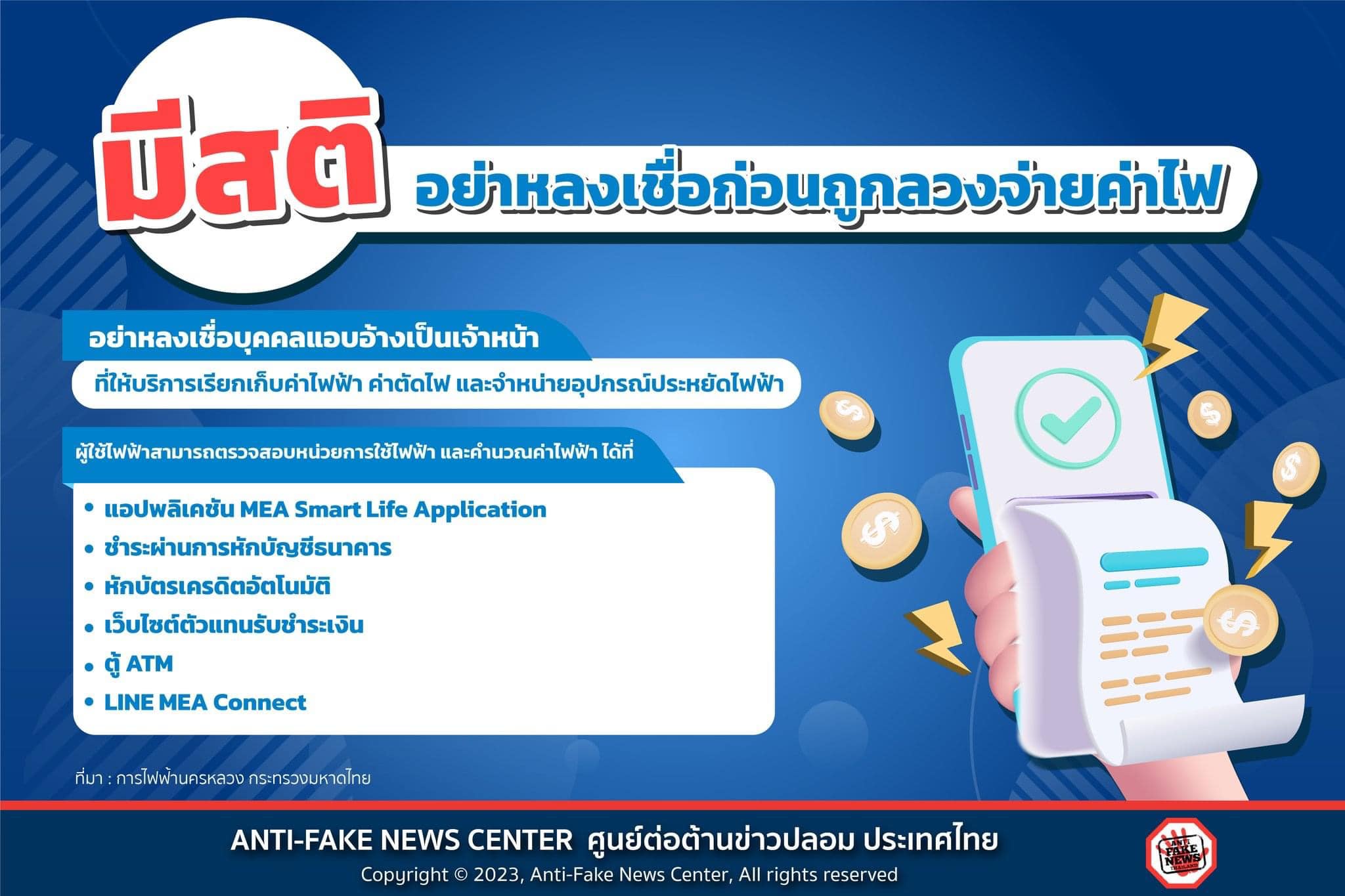 มีสติ อย่าหลงเชื่อ ก่อนถูกลวงจ่ายค่าไฟ เตือนประชาชน อย่าหลงเชื่อบุคคลแอบอ้างเป็นเจ้าหน้าที่ให้บริการ